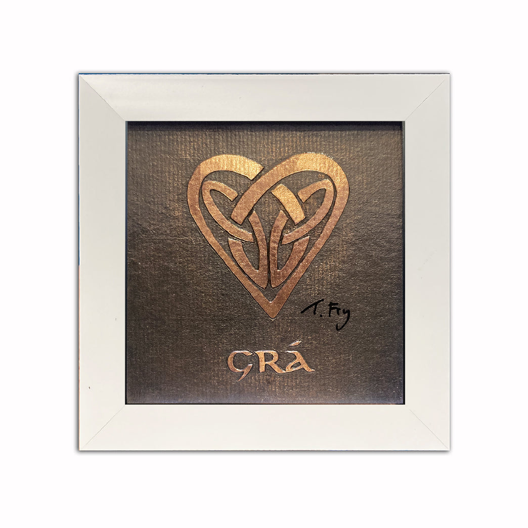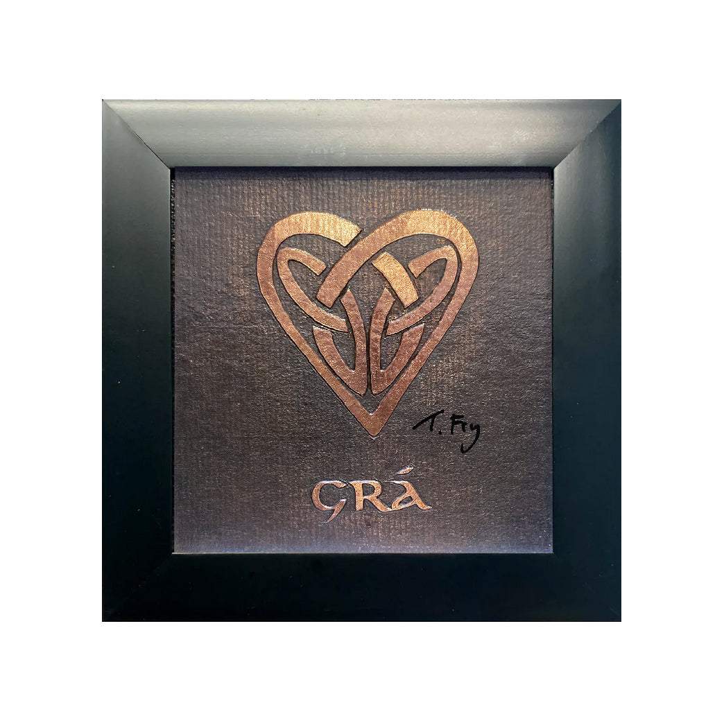 Framed and polished celtic design copper heart with a vibrant red background and the word grá, the irish word for love.